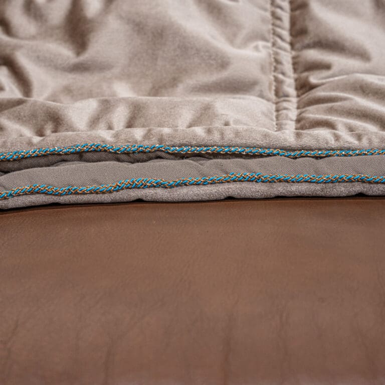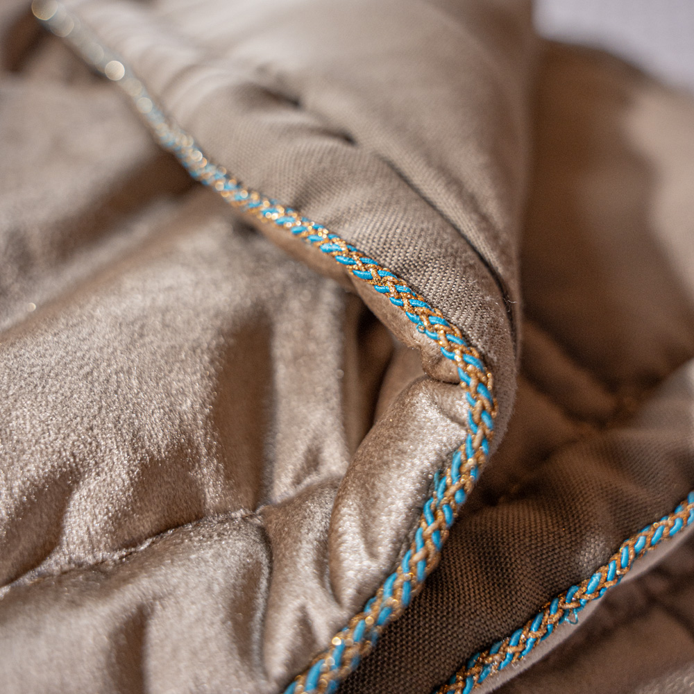 Aportando un estilo bohemio y lujoso a tu espacio, esta magnífica manta de arena y turquesa lucirá y se sentirá maravillosa colgada sobre cualquier cama, sofá o sillón. Deliciosamente elegantes y a la vez acogedoras y indulgentes, estas mantas completamente forradas son de terciopelo rico por un lado y algodón contemporáneo color piedra por el reverso, bordeado con un hermoso hilo turquesa y dorado. ¡Este es un estilo boho-lujoso para renovar tu espacio hoy y verte hermosa para la próxima década de moda y más allá!
